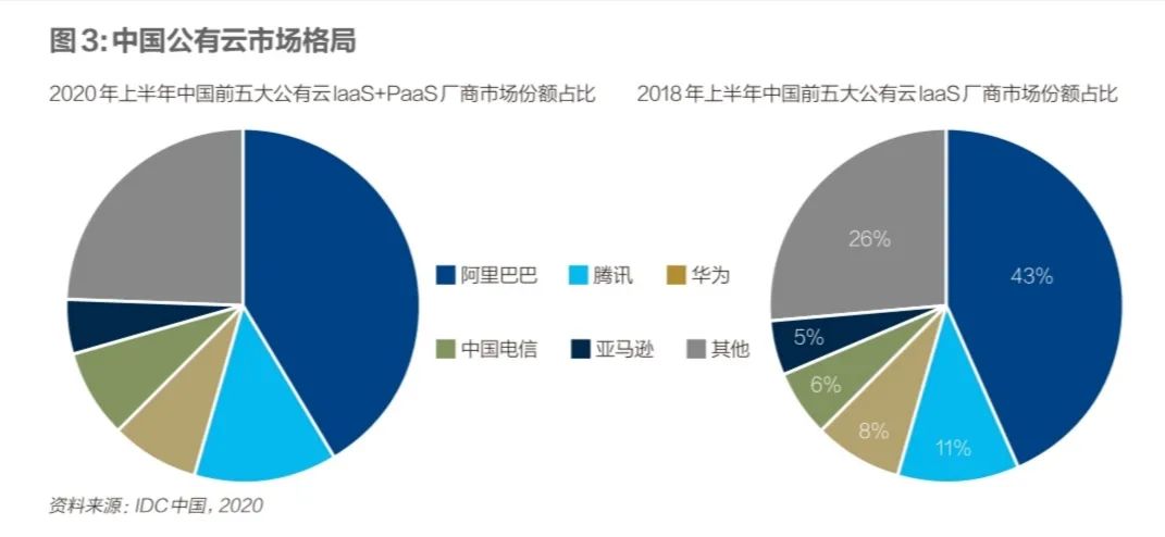 中国的云市场格局也在不断变化。第三方市场调研机构IDC最新发布的《中国公有云服务市场(2020上半年)跟踪》报告显示,2020上半年中国公有云服务整体市场规模(IaaS/PaaS/SaaS)达到84亿美元,同比增长51%。其中IaaS市场同比增长57.1%,PaaS市场同比增长64.4%。