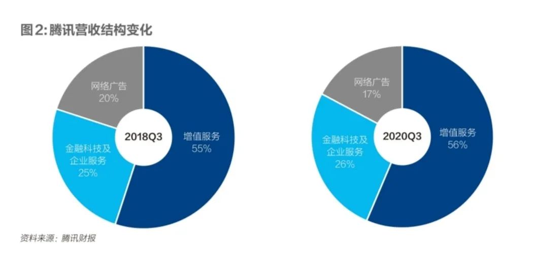 增值服务的主要构成是网络游戏和社交网络收入,后者包括直播、音视频会员、游戏虚拟道具。金融科技主要包括支付和理财业务,由腾讯的企业发展事业群(CDG)负责,企业服务由CSIG担纲。