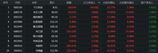 从个股来看,主力资金最青睐的3只股票分别是TCL科技、N艾力斯、美的集团,流入金额分别为14.02亿元、4.86亿元、4.08亿元,所对应的涨幅分别为10.03%、78.62%、2.71%。