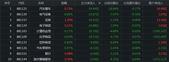 主力资金流出的板块分别是汽车整车、电气设备、证券,主力资金流出金额分别为39.49元、23.87亿元、16.52亿元,其中散户净流入金额为16.49亿元、1.07亿元、13.26亿元。