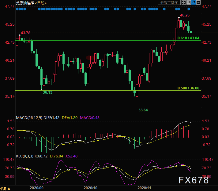 :MACD高位有死叉趋势,KDJ死叉,中线看涨因素不变,短线有回调需求,不过经过此前几个交易日的回调之后,空间已相当有限,下方面临43.78一线的强支撑,进一步支撑在43关口,上方压力位在11月25日高点46.26,进一步47关口将提供部分压力。