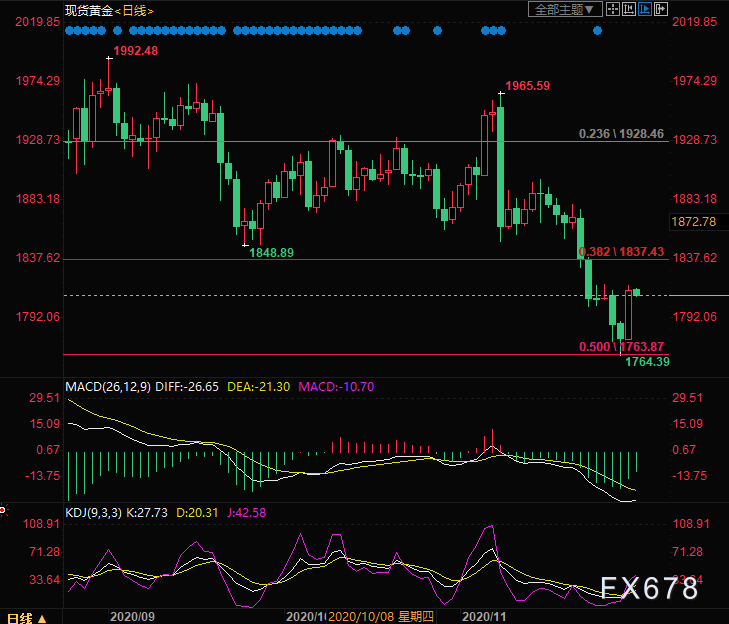MACD绿柱缩小,有形成金叉之势,KDJ底部金叉,中期黄金跌势难改,空头牢牢把控盘面,短线有进一步反弹需求,K线在低位形成“吞没看涨”的底部信号,而且是一阳吞多阴,警惕震荡筑底的可能性。不过目前多空方向不易判断。长期来看,中长线见顶风险有所增加,关注1899支撑位多空争夺;5月18日高点1765下方是密集成交区,存在较强的支撑。若跌破1800一线,下一个支撑位在1764一线,4月14日高点1747将提供一些支撑,下方强支撑位在1690-1700区间,若继续回升,上方压力位在38.2%斐波那契回档位1837一线和9月24日低点1850一线附近,8月12日低位1863也将提供部分支撑。