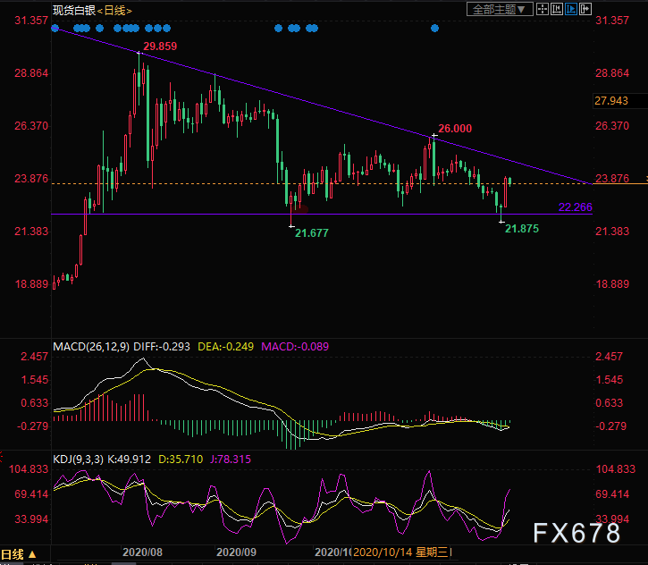 MACD接近金叉,KDJ金叉,短线看涨信号有所增加,空方势头昨日中断,低位类似“十字星“K线后紧跟大阳线,构成”启明星“底部信号,而且是强支撑位附近的启明星组合。周三白银跌超1%,主要是受到55日均线24.14附近阻力的压制,在失守5日均线23.23前,银价存在进一步反弹机会,初步阻力在55日均线24.14附近,进一步阻力在9月23日高点24.5附近,100日均线阻力在24.89附近。下方支撑在22.89的38.2%斐波那契回档位,进一步支撑在21.67关口可提供支撑,强支撑在50%斐波那契回档位20.74附近。