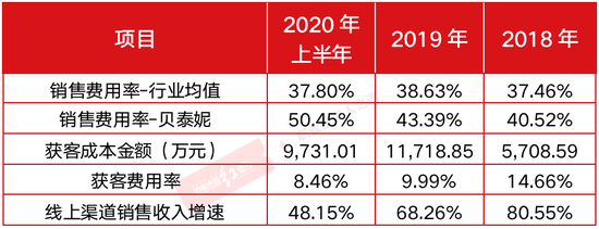 虽然乘着电商销售的东风,贝泰妮的营收规模迅猛增长,2018年、2019年,该公司分别实现营业收入12.4亿元、19.44亿元,营收增速分别为55.44%、56.69%。但紧随其后的还有暴增的营销费用,上述期间,贝泰妮销售费用分别达5.03亿元、8.43亿元,而其中渠道及广告宣传费占比五成以上,可见其在营销投入方面不遗余力。