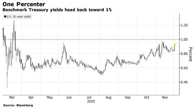 受对美国刺激计划的乐观情绪重燃以及疫苗方面传来的积极消息提振,本周美债收益率大幅飙升。指标10年期美债收益率周三升至0.9393%。两年/10年期公债收益率差达到2018年2月以来最阔水平。