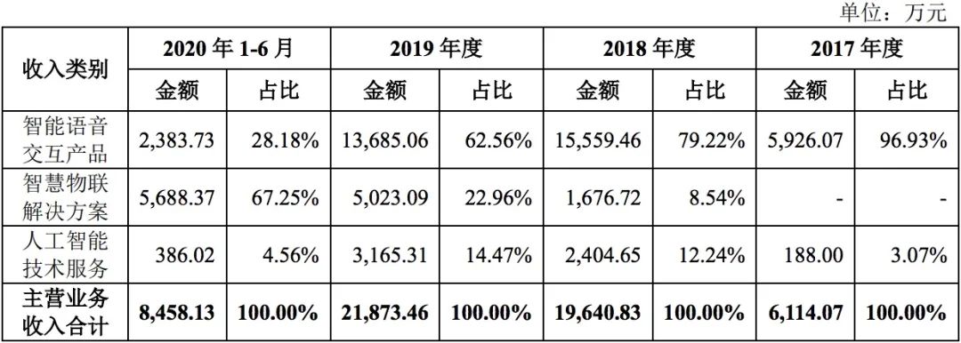云知声的主营业务包括智能语音交互产品、智能物联解决方案和人工智能技术服务。据招股书数据披露,2017年至2019年及2020上半年,该公司主营业务收入占营业收入的比重均超99%,分别高至100.00%、99.92%、99.77%和99.87%。