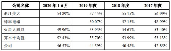 而上述同期,浙江美大等同行业可比公司的毛利率均值分别为53.13%、53.99%、55.70%、52.43%,其中在2017年度至2019年度超出亿田智能毛利率约10个百分点。