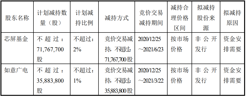 其中芯屏基金拟以集中竞价方式减持不超过7176.77万股彩虹股份,即减持不超过彩虹股份总股本的2%。