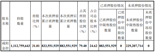 截至公告披露日,咸阳金控持有彩虹股份11.13亿股,占彩虹股份股份总数的31.01%,累计质押股份数量为8.84亿股,占其持股数量的比例为79.40%,占公司总股本的比例为24.62%。