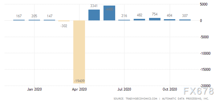 北京时间周三(12月2日)晚公布的美国11月ADP就业人数录得30.7万人,远不及预期的43万人,前值36.5万人修正至40.4万人。此次ADP数据是自5月份就业复苏开始以来的最小增幅。这将使就业人数比2月份的峰值减少约960.9万人。与6月份创纪录的增长478.1万人相比,就业增长有所降温。