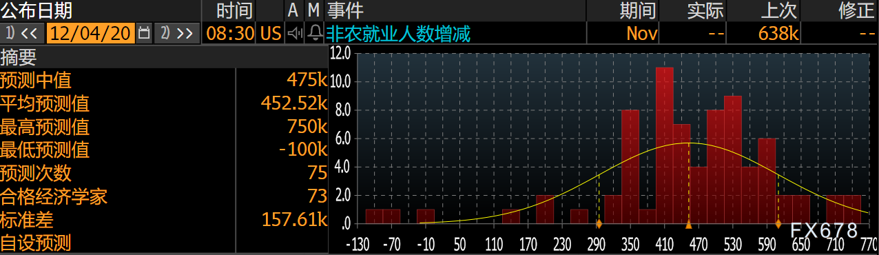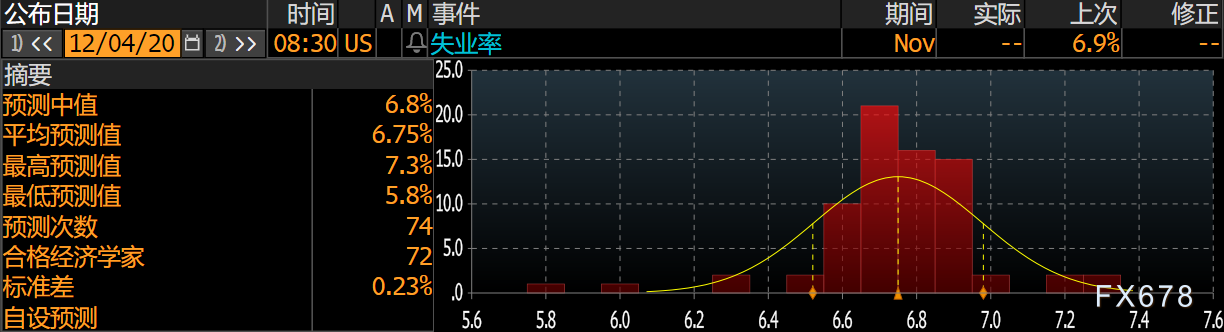 据彭博调查的经济学家预测,周五的就业报告将显示11月非农就业增加475000,失业率下降0.1个百分点至6.8%。尽管这是自5月就业开始反弹以来最小增长,而且就业岗位比疫情爆发前少了960万个,但就业市场的表现仍好于分析师几个月前的预测。
