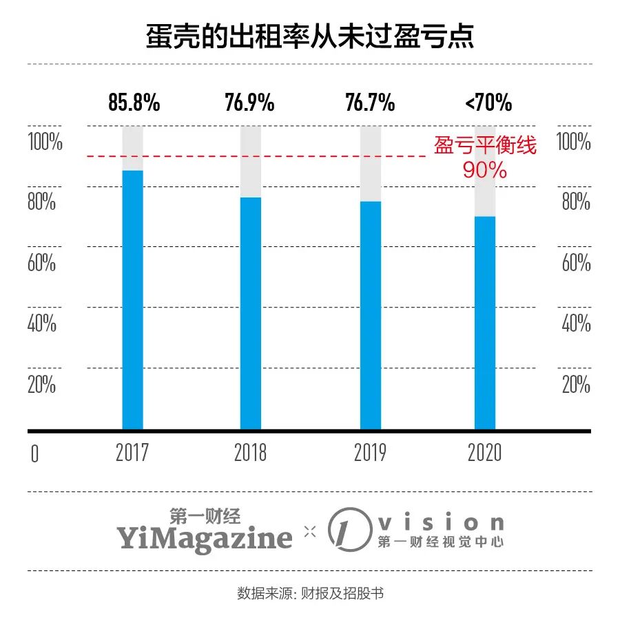 2017年至2019年,蛋壳公寓的出租率分别为85.8%、76.9%和76.7%,从未达到业界认为的盈亏平衡点——90%。