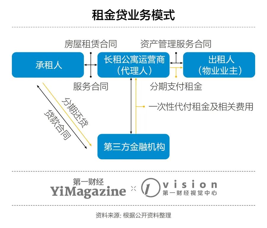 租金贷是互联网金融领域的一种创新产品,2015年前后随着长租公寓兴起而在市场上出现。在这种金融产品的支持下,租客与公寓运营方——即“二房东”——签订租房合同后,与公寓合作的金融机构会一次性把租客合同期内的所有租金支付给公寓运营者,而公寓运营者则只按月或按季向房东支付租金。同时,租客按月或按季向金融机构偿还贷款。