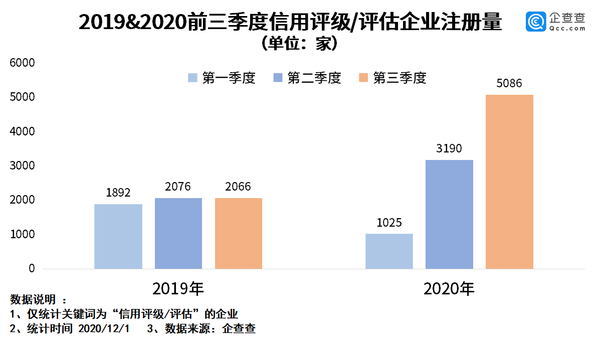 企查查数据显示,2020年前三季度,我国信用评估/评级相关的企业一共新注册了9301家,同比增长54.1%,每个季度的注册量呈现增长趋势。其中,第一季度注册量是1025家,第二季度3190家,第三季度5086家。