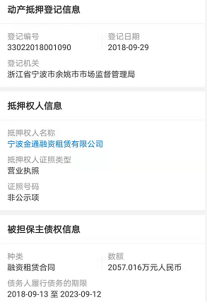 但是据余姚市市场监督管理局公示的动产抵押登记信息(登记编号:33022018001090)显示,此项融资租赁合同数额共计2057.016万元,这与招股书披露的租赁物件总价款并不一致。