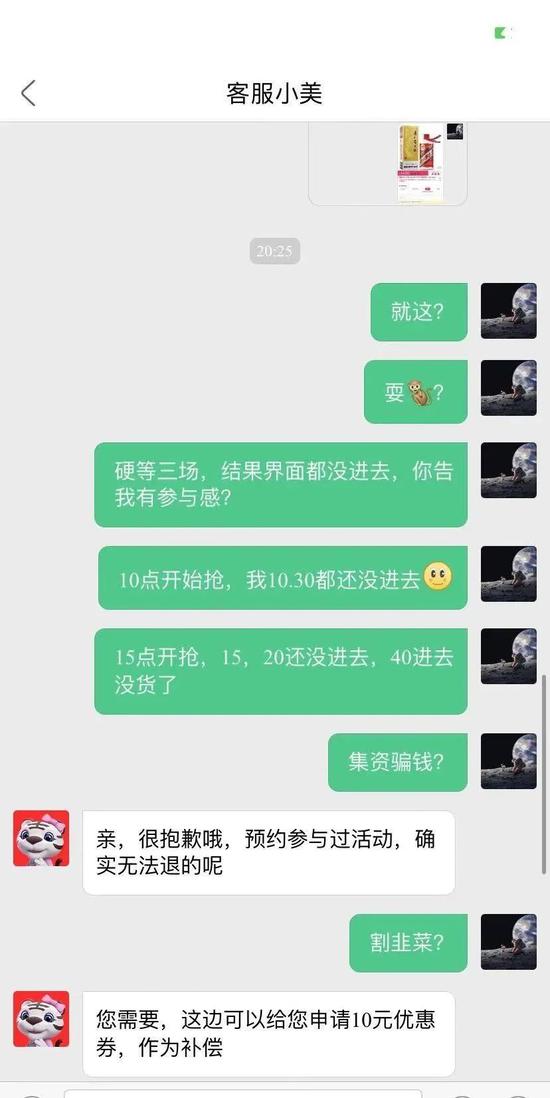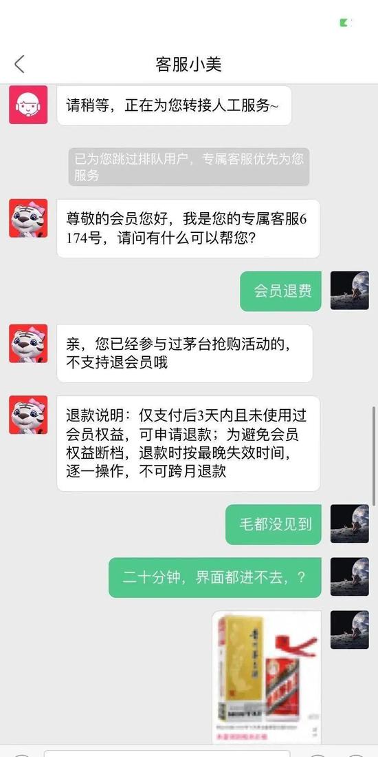 而关于无法退款的原因,张浩得到的答复是“购买超过3天退不了。”而同样参与此次活动的李阳得到的回复却是,“参加了抢购茅台的活动,无法退费。”