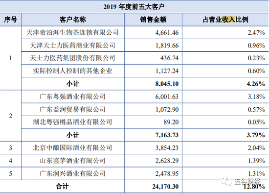 以2019年为例,天津天士力医药商业有限公司、天士力医药集团股份有限公司、天津帝泊洱生物茶连锁有限公司和闫希军控制的其他企业,就为国台酒业贡献了8000万元以上的收入,占比在4.26%左右。