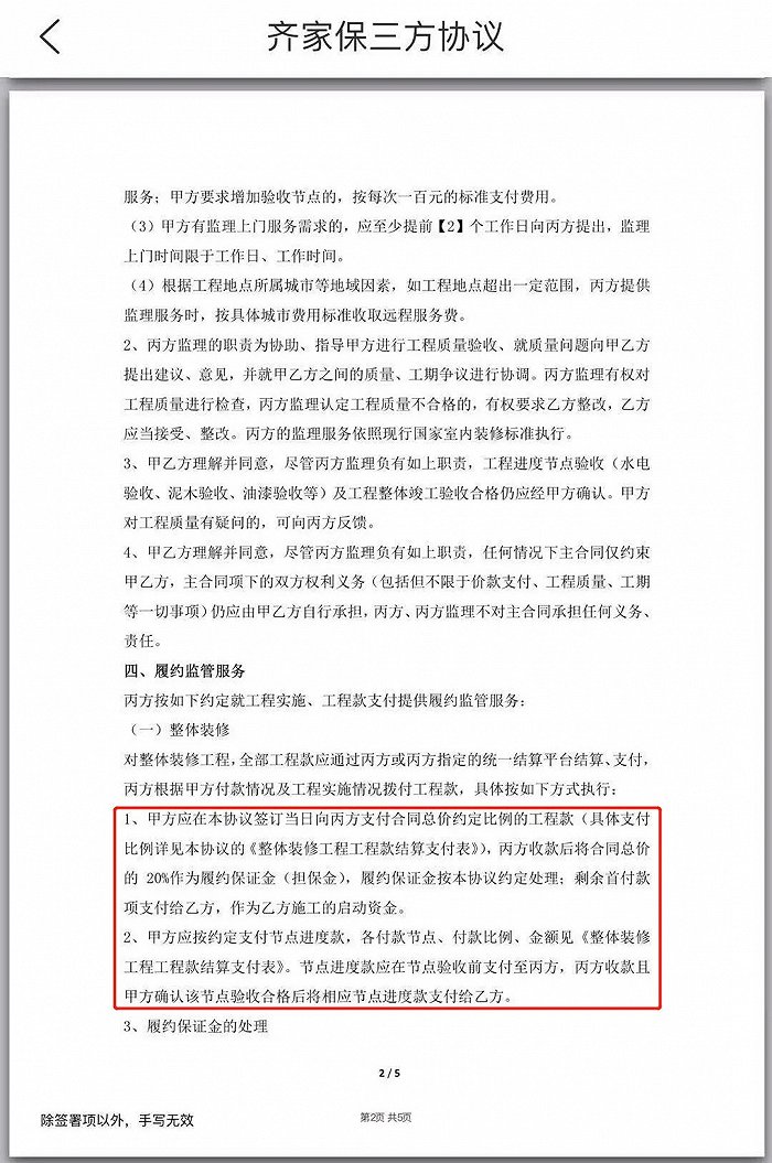 关于这两个平台的划款标准,赵凌飞告诉锌刻度,齐家网的合同规定了需要在甲方(消费者)确认验收合格后才将装修款支付给乙方(装修公司)。至于占合同总价20%的履约保证金(担保金),甲方有异议需要在3个月之内以书面形式提出,要求平台暂缓向乙方付款,超过这一时限齐家网则可以直接支付给装修公司。