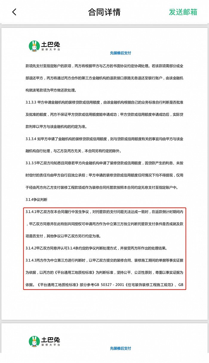 而土巴兔的第三方合同,则清晰列明,甲乙双方均授权由平台判断是否应该付装修款,如果平台判断该付,那么就可以直接付款。