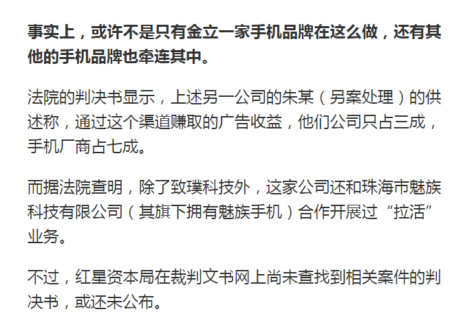 据红星新闻报道,12月5日,红星资本局通过中国裁判文书网翻阅发现,金立参股的一子公司,通过和其他公司合作,曾将木马程序植入到约2652万台金立手机中,以“拉活”的方式赚钱。