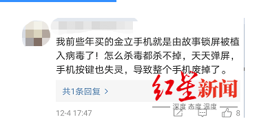 “我前些年买的金立手机就是由故事锁屏被植入病毒了!怎么杀毒都杀不掉,天天弹屏,手机按键也失灵,导致整个手机废掉了。”有网友表示。