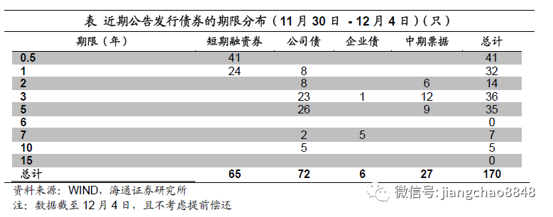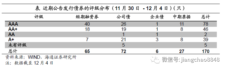 信用债等级利差小幅走阔。具体来看,截至12月4日,1年期短期品种AA级与AAA级中票利差为53BP,与上周末持平;3年期AA级与AAA级中票利差为63BP,较上周末上行1BP;5年期AA级与AAA级中票利差为70BP,较上周末上行2BP。