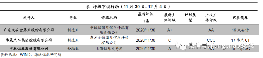 l一周评级调整及违约情况回顾:上周有3项信用债主体评级上调,涉及主体为长园科技集团股份有限公司、申万宏源证券有限公司和青岛西海岸发展(集团)有限公司,有3项信用债主体评级下调,涉及主体为广东太安堂药业股份有限公司、华晨汽车集团控股有限公司和中泰证券股份有限公司。上周新增违约债券3只,发行主体为海航机场集团有限公司、东旭光电(维权)科技股份有限公司和精功集团有限公司。上周无新增违约主体。