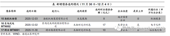 上周新增违约债券3只。15海航机场债违约本金8亿元,发行主体为海航机场集团有限公司。公司是以机场建设、运营管理为核心,拓展临空产业,并不断发展企业集团金融业务,形成了多元化的运营模式。作为海南省重要的机场集团,公司在推动地方经济发展发挥着重大的作用。