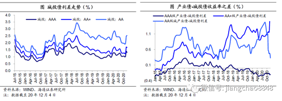 产业债与城投债利差分化,AA级信用债中城投表现显著好于产业债。具体来看,截至12月4日,本周末AAA级产业债-城投债利差目前在-21BP,与上周基本持平;AA+级产业债-城投债利差目前在161BP左右,较上周末上行8BP;AA级产业债-城投债利差目前在33BP左右,较上周末下行11BP。