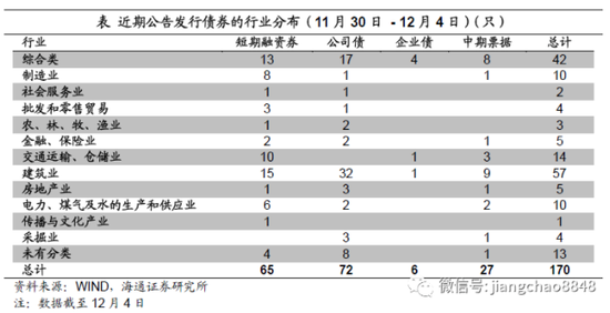 从主要发行品种来看,上周共发行短融超短融65只,中期票据27只,企业债发行6只,公司债发行72只,发行数量较前一个交易周减少。从发行人资质来看,AAA等级发行人占比最大为46%。从行业来看,建筑业行业发行人占比最大为34%,其次为综合类行业发行人,占比为25%。在发行的170只主要品种信用债中有24只城投债,占比约14.1%,发行数量比前一周有所减少。