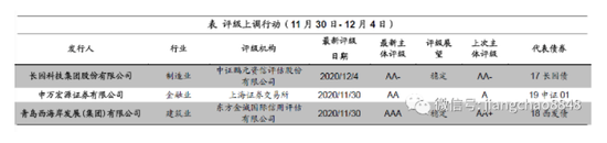 评级上调的发行人青岛西海岸发展(集团)有限公司非城投平台,来自建筑业,信用评级上周从AA+上调至AAA。主要原因是青岛市政府批准确定公司为青岛市国有资本投资运营公司改革试点企业,同时随着南京三宝集团等公司纳入合并报表范围以及澳柯玛集团及其下属企业股权转让及资源整合的推进,公司业务经营范围进一步扩大,经营实力明显提升。