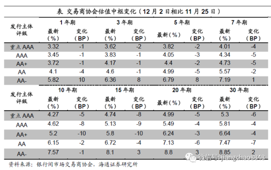 相比11月25日协会估值,上周(12月2日)中信用债估值收益率下行为主。
