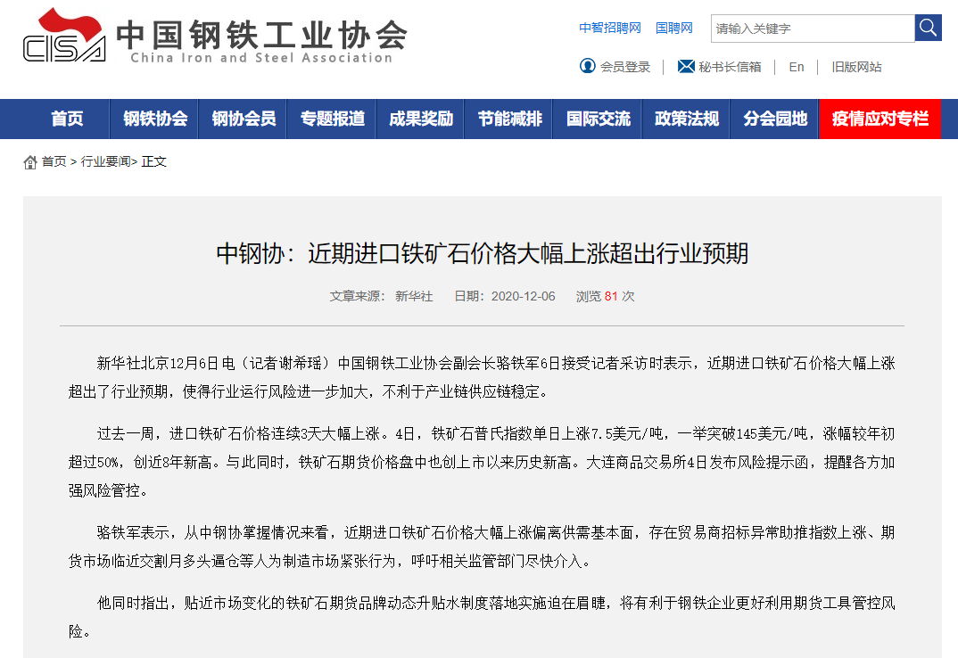 12月6日,中国钢铁工业协会(下称中钢协)表态近期进口铁矿石价格大幅上涨偏离供需基本面,存在贸易商招标异常助推指数上涨、期货市场临近交割月多头逼仓等人为制造市场紧张行为,呼吁相关监管部门尽快介入。此后,大连商品交易所(下称大商所)在官微发布公告,称近期已针对铁矿石等品种启动“五位一体”监管协作机制,将严格排查和打击违法违规交易。