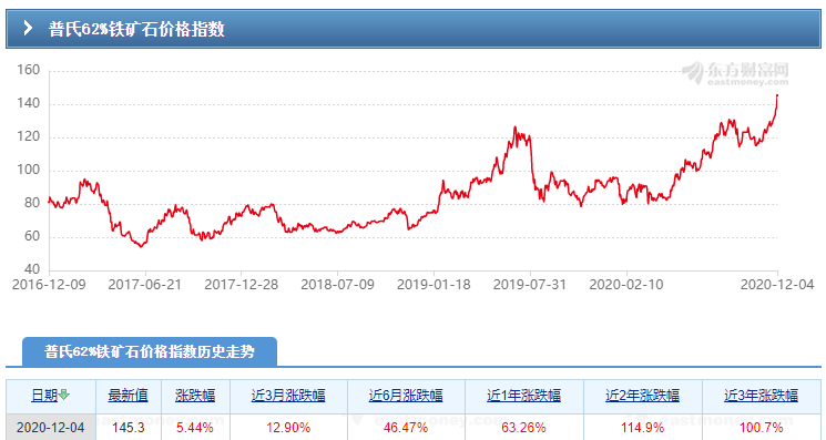 12月4日,铁矿石普氏指数单日上涨7.5美元/吨,一举突破145美元/吨,涨幅较年初超过50%,创近8年新高。