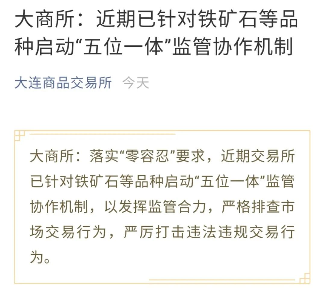 中钢协喊话后,大商所在12月6日晚间在官微发布公告称,落实“零容忍”要求,近期交易所已针对铁矿石等品种启动“五位一体”监管协作机制,以发挥监管合力,严格排查市场交易行为,严厉打击违法违规交易行为。
