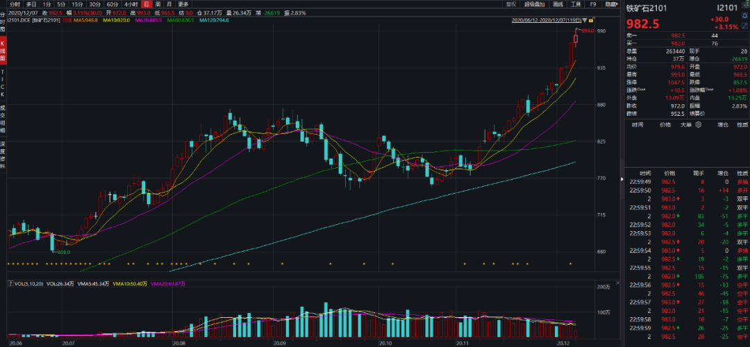 期货市场上,铁矿石期货涨势凌厉,交易所最新推出的风控措施短期看影响不大。周五夜盘交易时段大商所铁矿石期货继续上涨,主力I2101合约盘中最高涨至993元/吨,这一价格创出铁矿石期货2013年上市以来历史新高,绝对价格逼近千元大关。I2105最新价格为916元/吨,较前日结算价上涨4.51%,远月合约的涨幅更为惊人。