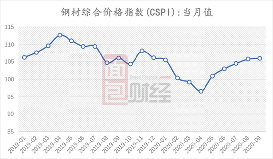 根据中钢协数据,钢材综合价格指数在2020年4月份触及年内低点。截至2020年9月,钢材综合价格指数为105.99点,较4月低点上涨9.7%。