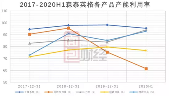 2017年-2020年上半年,切削刀具为公司贡献营收均超五成以上,但其产能利用率均低于工具系统和精密夹具。