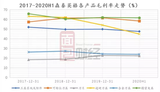 2020年上半年,森泰英格综合毛利率为46.75%,同比下降2.72个百分点,主要是因为报告期内,公司可转位刀具细分产品结构变化和超硬刀具调价的影响;净利率为19.53%,同比增长3个百分点,可能是因为其费用管控能力较强。