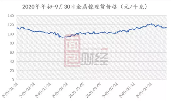 金属镍自今年二季度份开始,现货价格震荡上行。截至2020年9月,金属镍现货价格为114.1元/千克,较3月份最低点上涨23.55%。而合金钢中其他金属元素铬、钼、钨、钒现货价格依旧保持平稳。