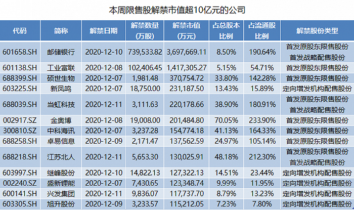 12月10日,上市一年的邮储银行(601658.SH)将面临73.95亿股首发限售股解禁,尽管占总股本的比例只有8.5%,却是解禁前流通盘的1.90倍。以最新收盘价(下同)计算,邮储银行此次解禁市值高达369.77亿元,也是本周A股市场解禁规模最大的公司。