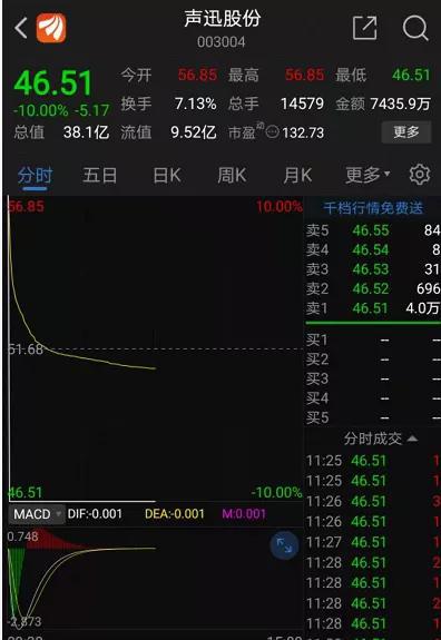 没有一丝丝防备!上市8天的声讯股份,在连获7个一字板后,早盘就被3700多手大卖单,从涨停板迅速砸盘至跌停,走出天地板,而从涨停到跌停也仅仅3秒钟。