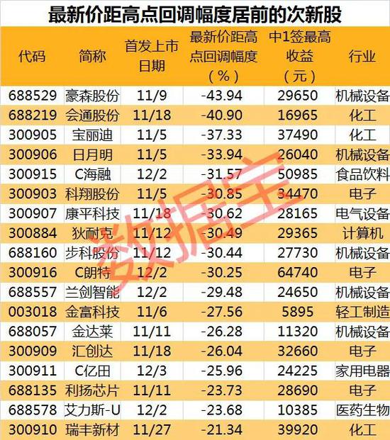 证券时报·数据宝统计显示,11月以来A股合计新上市34只股票,其中10只股票最新价距上市以来最高点回调幅度超30%。