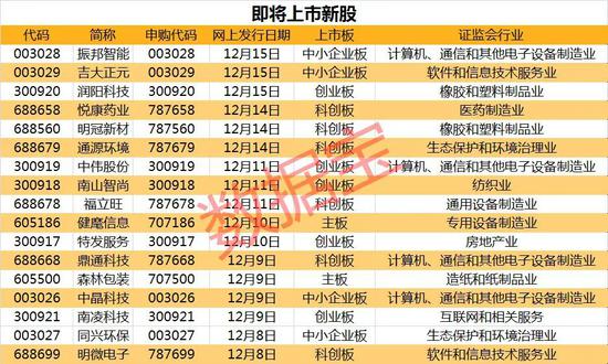 本周(12月7日到12月11日),有11只新股密集发行,包括受市场追捧的芯片股、锂电股、物业股等,具体来看沪市主板发行的有森林包装、健麾信息;科创板发行的有明微电子、鼎通科技、福立旺;中小板发行的有同兴环保、中晶科技;创业板有特发服务、南山智尚、中伟股份和南凌股份。