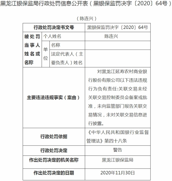 陈连兴对黑龙江延寿农商行上述第4项违法违规行为负有责任,黑龙江银保监局对其警告,行政处罚依据为《中华人民共和国银行业监督管理法》第四十八条。