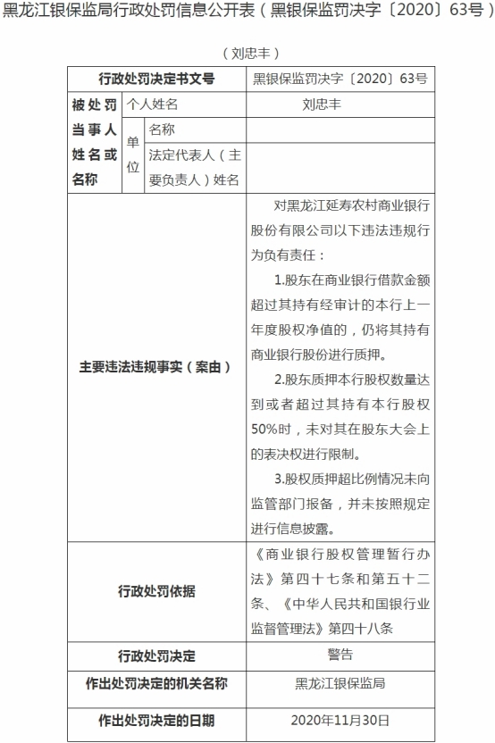 刘忠丰对黑龙江延寿农商行上述前3项违法违规行为负有责任,黑龙江银保监局对其警告,行政处罚依据为《商业银行股权管理暂行办法》第四十七条和第五十二条、《中华人民共和国银行业监督管理法》第四十八条。