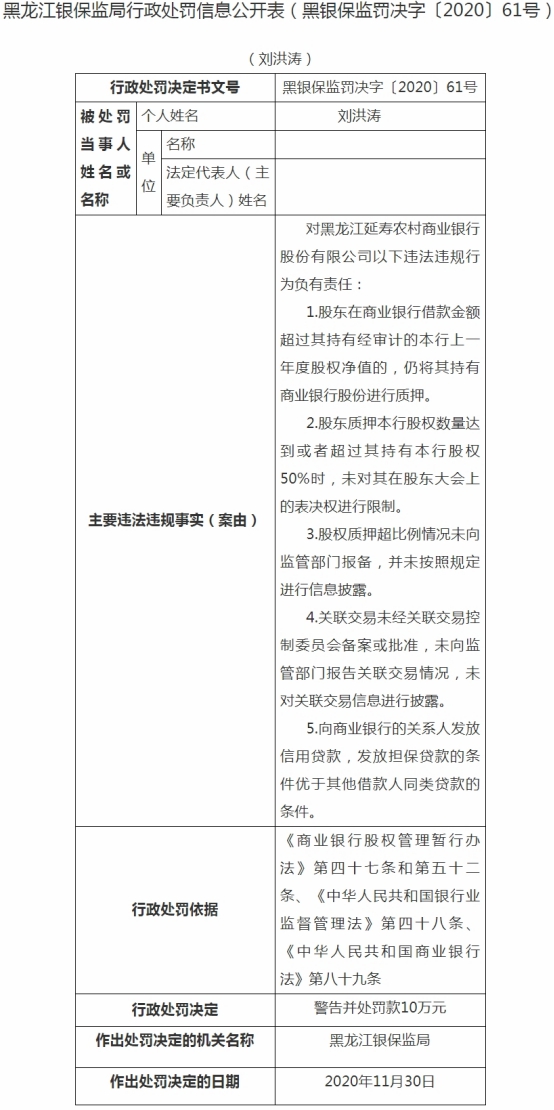 刘洪涛对黑龙江延寿农商行上述5项违法违规行为负有责任,黑龙江银保监局对其警告并处罚款10万元,行政处罚依据为《商业银行股权管理暂行办法》第四十七条和第五十二条、《中华人民共和国银行业监督管理法》第四十八条、《中华人民共和国商业银行法》第八十九条。