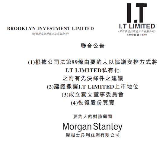 知名时装品牌I.T官宣“私有化”!据港交所公告,I.T Ltd.已与Brooklyn Investment Ltd.商定私有化方案。根据方案,其他股东持有的非创办人股份将以每股3港元注销,实施该方案总计需要大约13.1亿港元现金。