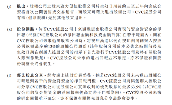 同时,根据方案,创办人集团(沈嘉伟、沈健伟兄弟)需要以手中持有的13%股份作保,在未来CVC全额获利退出后,两兄弟的股份将得以归还,若CVC不能全额退出,该私募基金将享有沈嘉伟、沈健伟兄弟持有股份相当的最多63.5%的优先股息。
