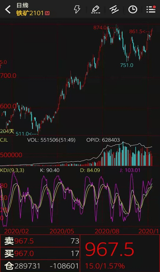中证君统计发现,2020年10月26日,铁矿石主力合约最低为756.5元/吨,相比12月7日的盘中高点993.0元/吨,期价上涨幅度达到31.3%,期间多次刷新历史纪录。